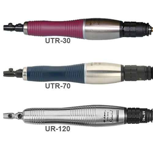 Los 3 modelos codificados por color están provistos con una manguera de aire, acoplador, mangos de espuma y tres porta herramientas para herramientas planas de 1mm hasta 1/8” y herramientas redondas de 3mm. Requiere Filtro/Regulador-Lubricante.